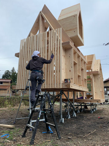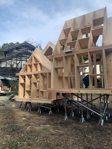 At the same time we were considering Nature shouldn't be harmed by foundation such such as using concrete for the foundation. That's why we introduced MegaAnchor (origin Italy) to use first time in Japan. Metal pipes gently drilled into the land and connected with metal joints to the upper structure. We intentionally tried two different levels for two units for challenging construction technics such as connections between each other.